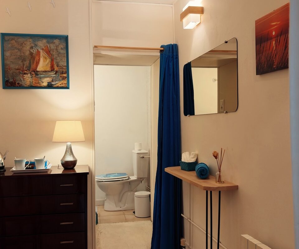 Bateau (16 m²) est la plus naturellement fraîche de notre vieille maison aux épais murs de pierre. Accès facilité pour les personnes qui ne peuvent monter à l’étage par les escaliers (une seule marche pour y accéder). Sa petite salle de bain équipée d’une douche est lovée entre 2 gros murs de pierre de 80 cm.