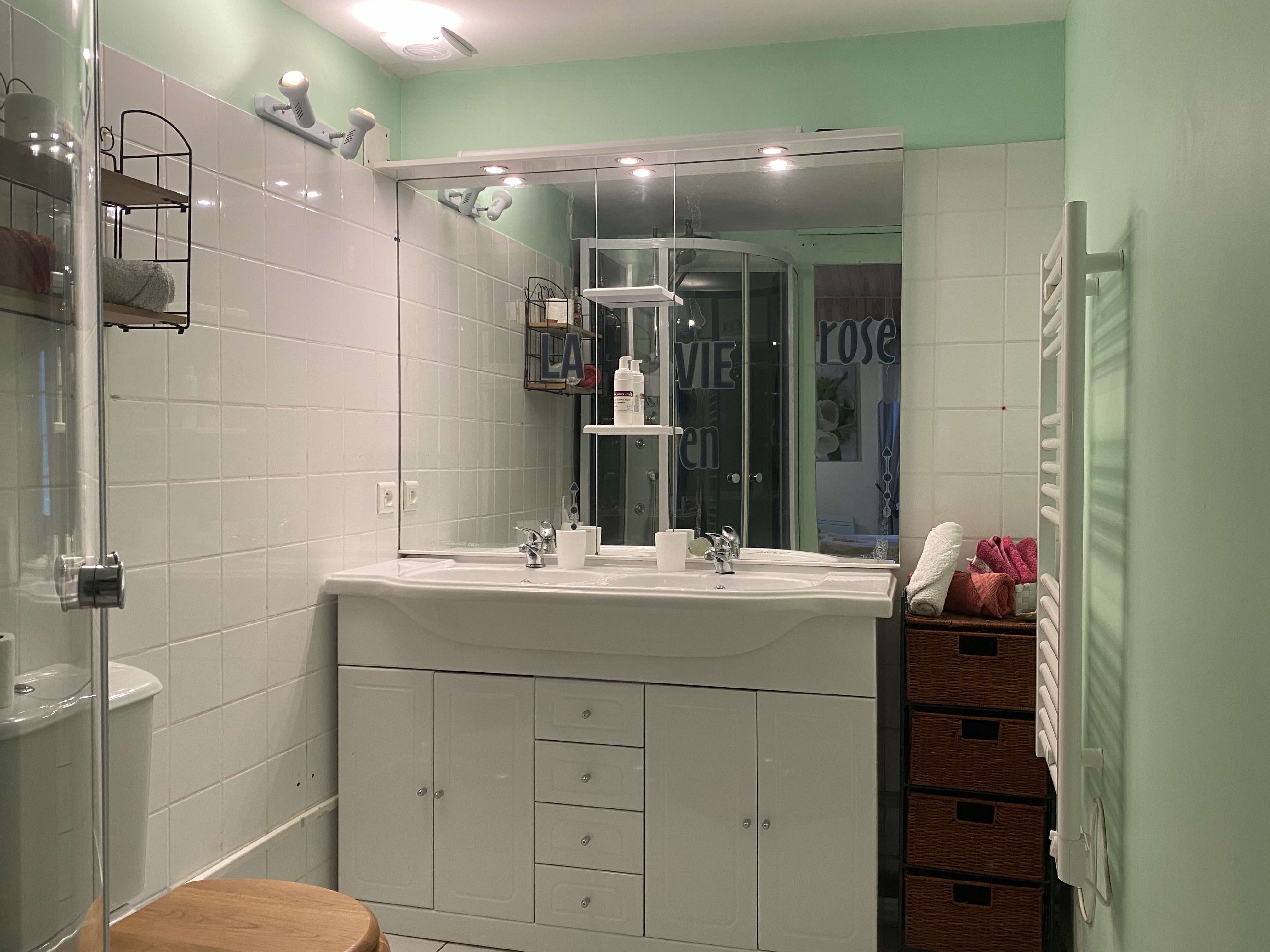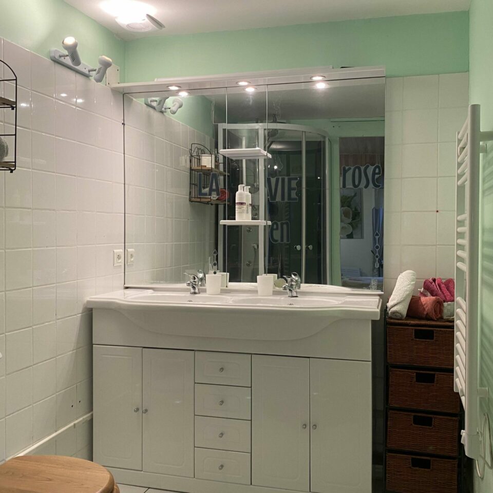 Au premier étage, avec salle de bain attenante, double lavabo, douche d’angle et wc.