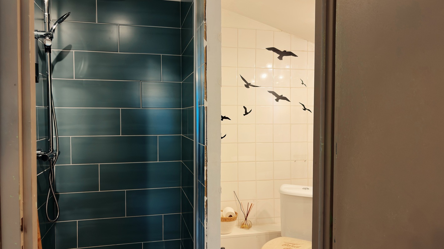 Suite en 2 parties au premier étage, séparées par une porte coulissante.  Salle de bain attenante à la deuxième partie, avec grande douche et wc.